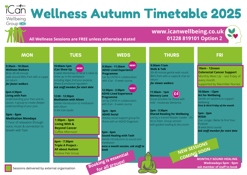 Wellness is a branch of iCan Wellbeing Group based in Carlisle, our centre is located right next door to iCan fitness so people can enjoy the benefits of both fitness and well-being in one place. Our Wellness provision focuses on emotional & social wellbeing.